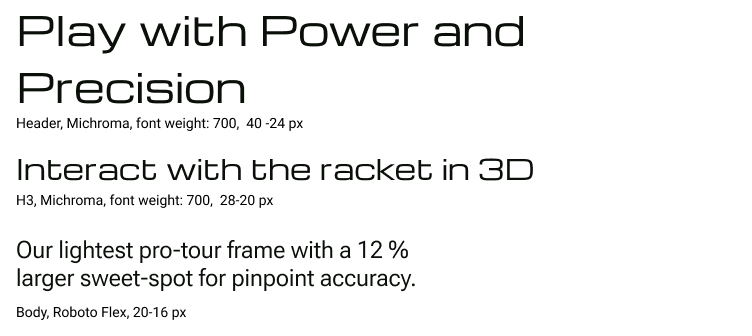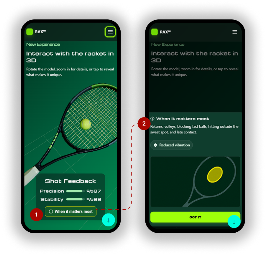 In this MVP section, tapping the tennis ball triggers animated bar graphs, revealing key performance metrics of the racket. This interaction was designed to keep the product evaluation playful yet informative, turning complex specs into instantly scannable visuals. By embedding interaction into the product story, users can explore details without leaving the flow of the page.